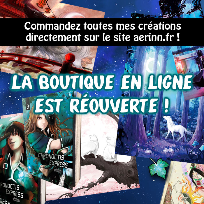 J’ai une annonce à faire: malheureusement, Chronoctis Express est en pause depuis plusieurs mois. La vente des livres et les soutiens sur Tipeee et Patreon (dont je suis extrêmement reconnaissante ♥) ne sont pas suffisants pour que je puisse en vivre. Les ventes du tome 3 ont été mauvaises en librairie… LIRE LA NEWS ► - Japan Expo 2023 !