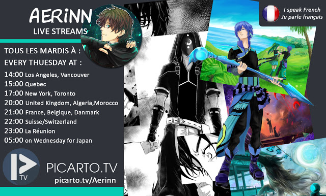 A partir d’aujourd’hui, je vais tenter de faire des streams en direct tous les mardis soir à partir de 21h ! Le prochain commence dans quelques heures, une illu couleur à terminer (en priant pour que mon pc ne plante pas :P) https://picarto.tv/Aerinn