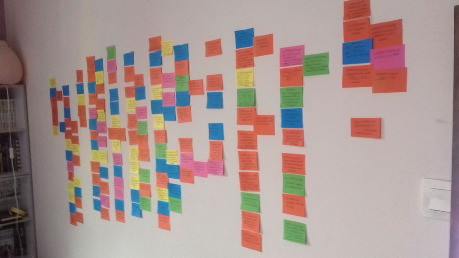 Voici une photo de mon mur, avec toute l’histoire de Chronoctis Express sous forme d’index cards.